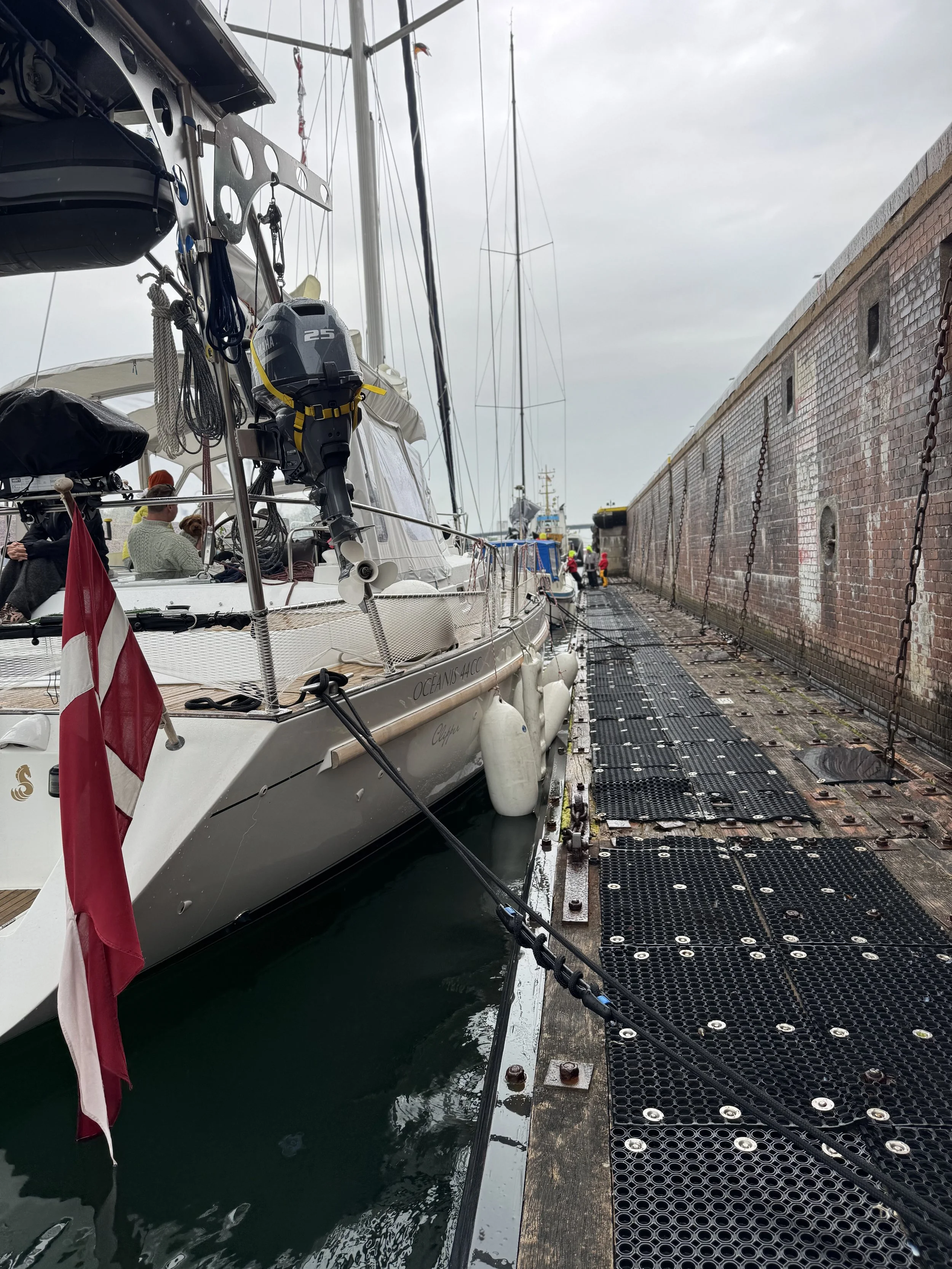 Heldigvis kendte vi nogle andre danske både, som lå i havnen, og som vi kunne skrive til for at koordinere, hvor vi kunne lægge os. Med den manøvre, vi skulle til at lave, skulle det være langskibs.