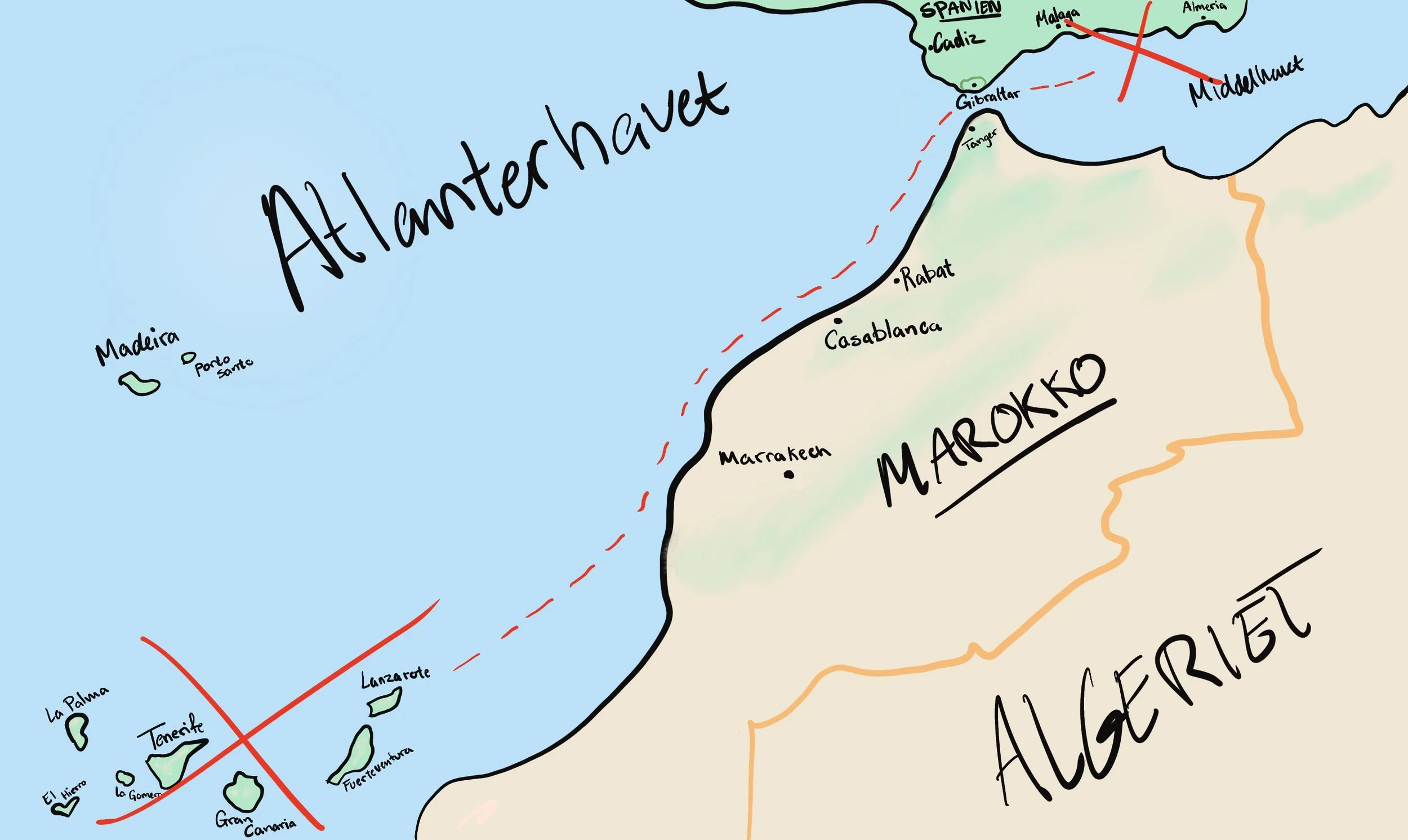 Som beskrevet er målet De Kanariske Øer, og vi har selv en drøm om at sejle via Marokko. Hvis tiden og mulighederne i forhold til rute og vejr byder sig, lægger vi derfor eventuelt et par stop ind undervejs langs den marokkanske kyst.