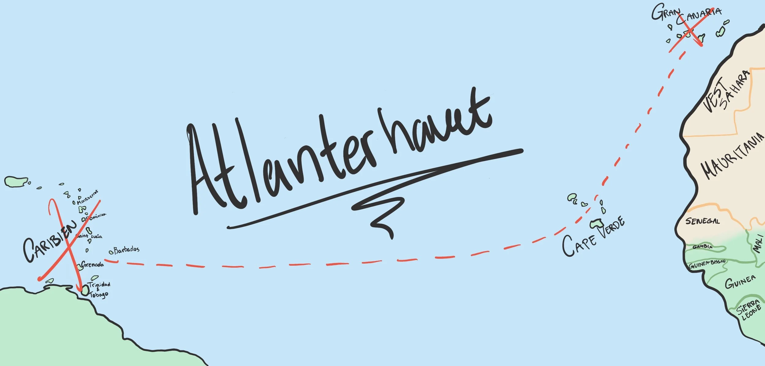 Rutevalget over Atlanten afhænger af vejret, men ofte betyder det, at vi starter med at sætte kursen i sydlig retning mod Cap Verde-øerne, om vi går i land her må tiden vise. Herfra drejer vi stævnen mod vest, indtil vi rammer de caribiske troper. Vi planlægger at sejle mod Tobago i det sydlige Caribien.